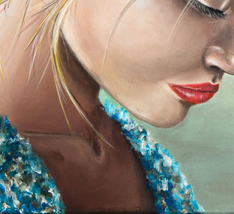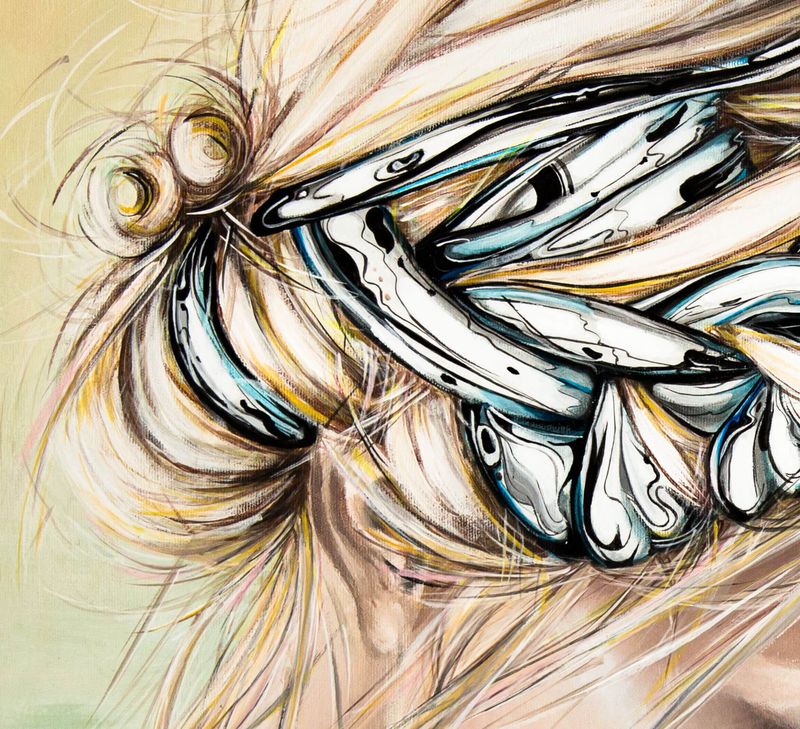 In the journey of exploring the opposites, this series shows how emotions and metallic work together. Is Metallic just another emotion that fades away or is it overwhelming for a human being? Where does it begin and where does it end? The painting shows a beautiful young woman with blond hair and a braid. The braid is wrapped in shiny metal which represents hidden emotions. Her hair is carried by the wind in all directions and emanates from a metal braid as warm emotions in human nature that try to beat those cold ones.