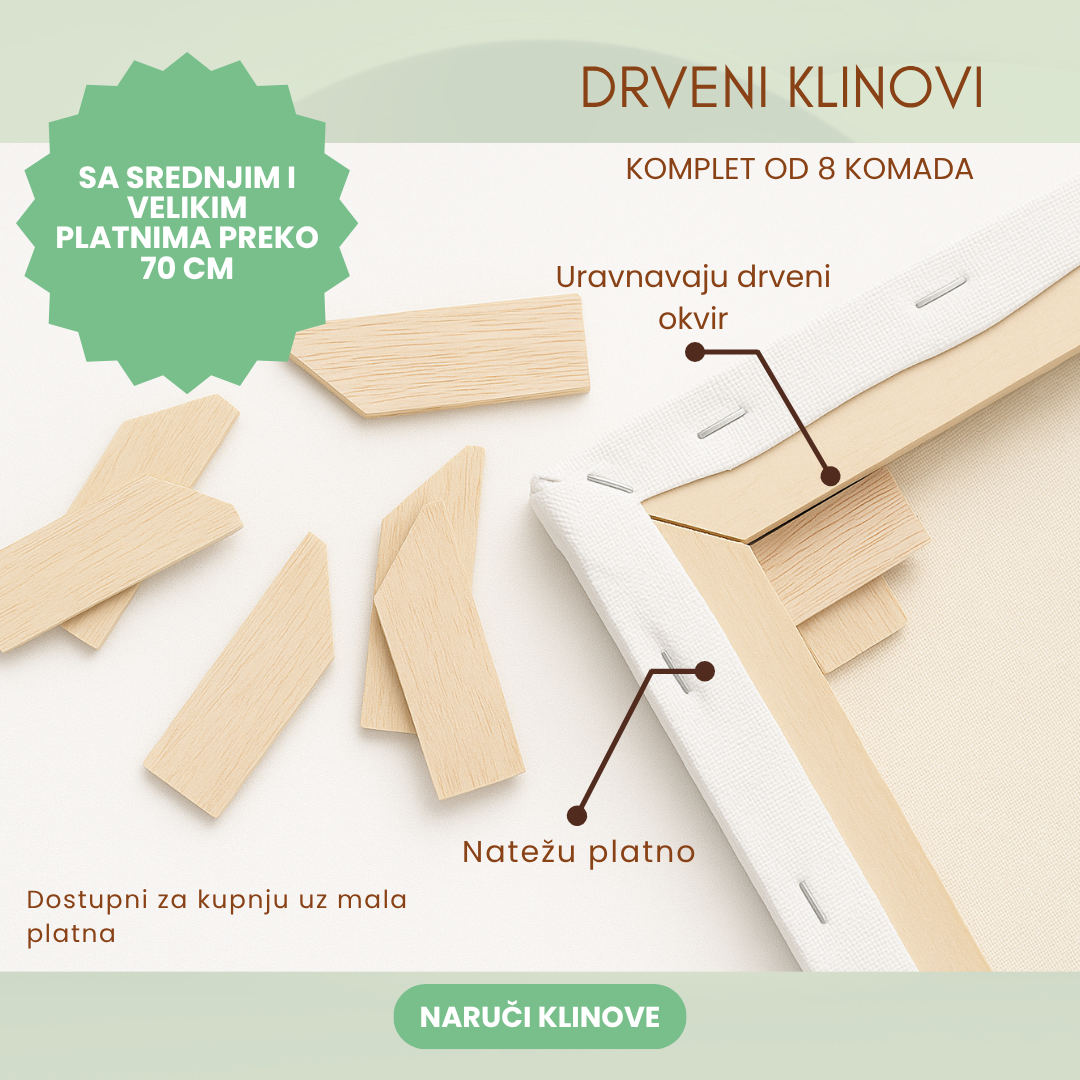 • 8 komada drvenih klinova uključeni s platnima veličine 70 cm bilo koje stranice